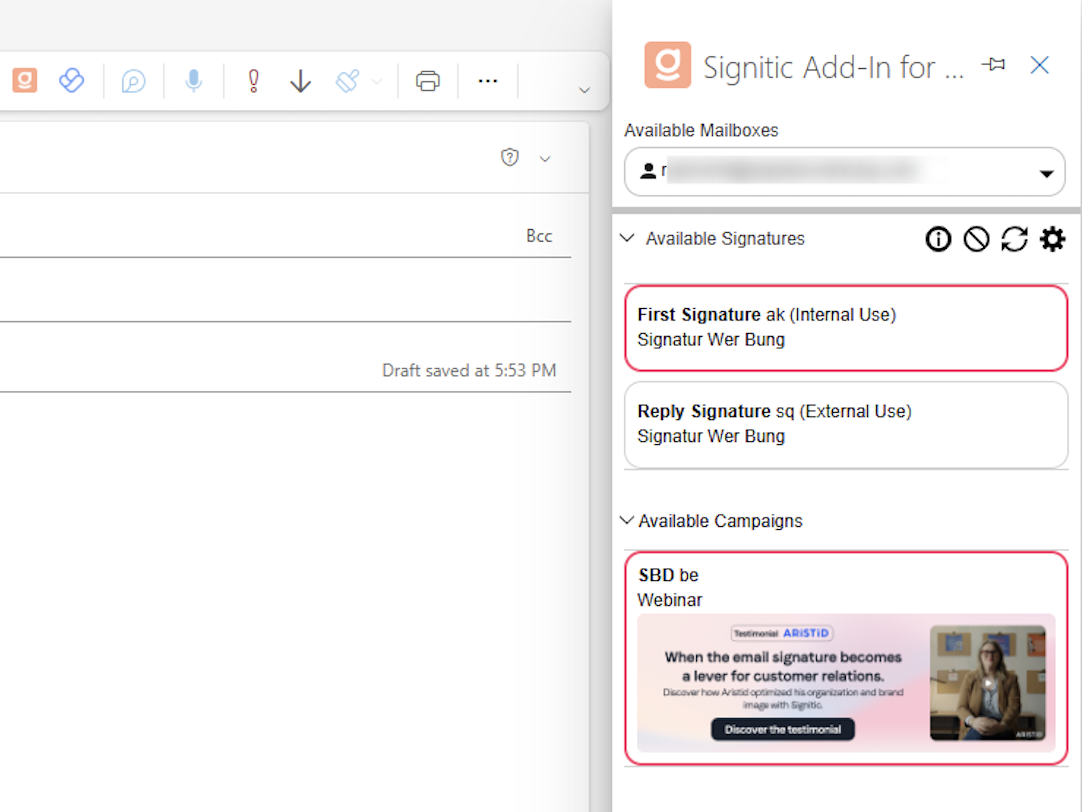 5. Wenn Sie auf das "Signitic Coral"-Symbol in der E-Mail-Erstellungsleiste klicken, wird das Add-In im rechten Outlook-Fenster geöffnet: