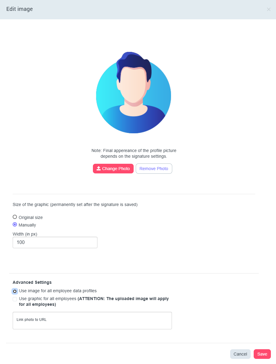 Tip. Define the size in which the staff picture should be displayed in the signature within your signature template and upload a picture that is twice as large as the final display size. This will ensure that the image is displayed correctly, even at high resolutions.